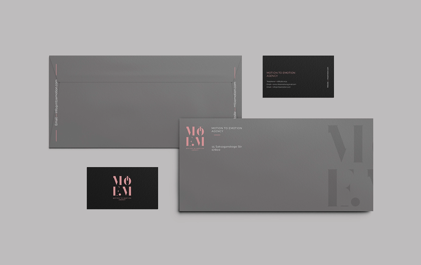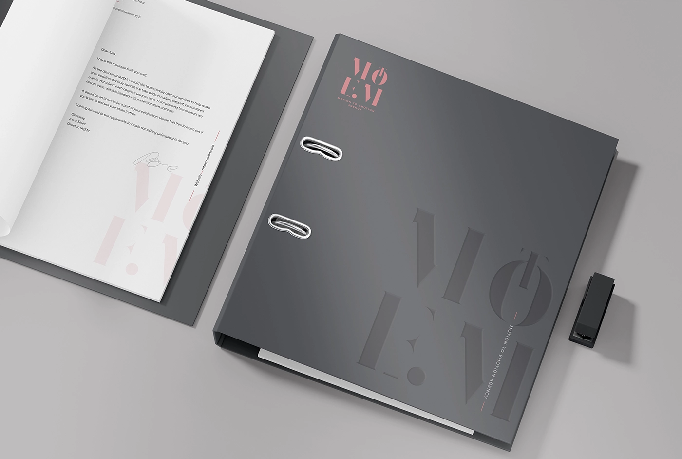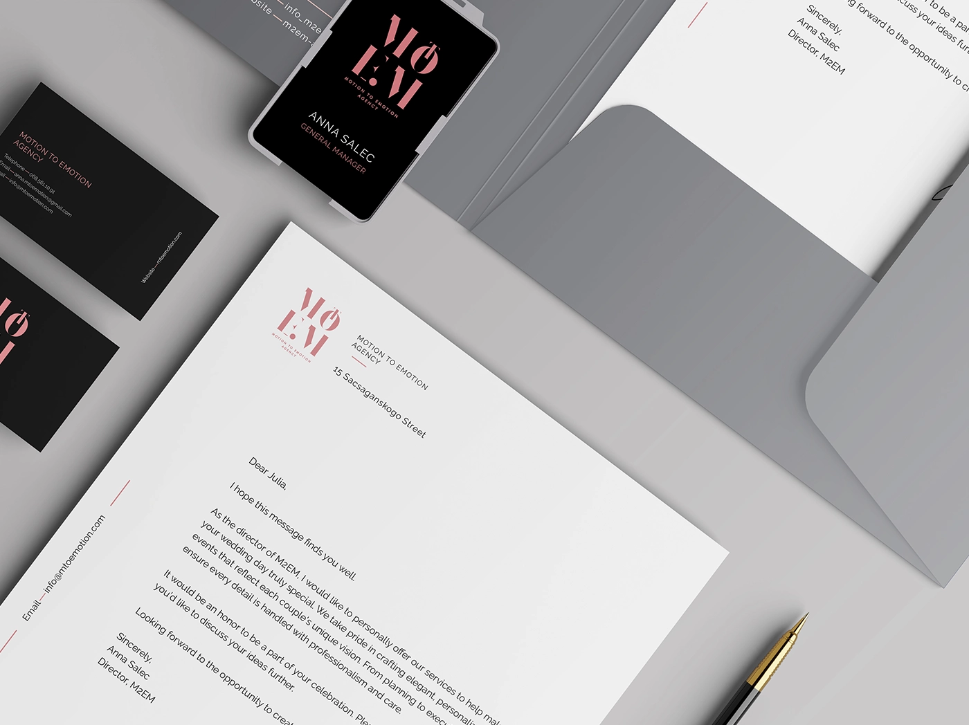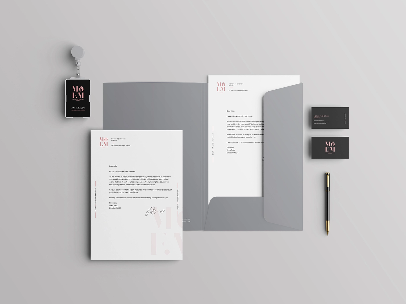 The corporate identity is developed on a flawless integration of branded elements reflecting the agency’s sophisticated and modern look. Business cards radiating expertise and exclusivity show a startling contrast between matte black and soft coral pink. With understated branding elements, letterheads keep a simple and elegant approach that highlights communication’s clarity and grace. Designed with elegant finishes and embossed typeography, envelopes and folders improve tactile experience and guarantee a quality feel. Using premium fabrics and well placed accents to improve brand impression, branded shopping bags have the same elegant look. From all physical and digital touchpoints, office supplies—binders, badges, digital apps—keep uniformity and a flawless brand experience.